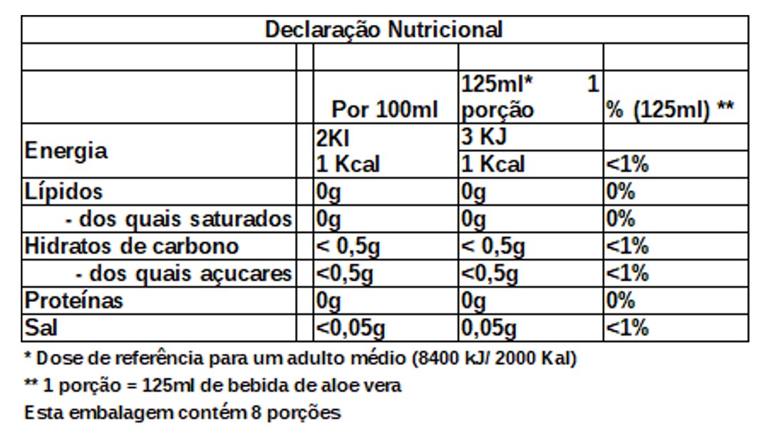 Ingredientes: 89,2% de Aloé Vera Gel purificado (aloé Barbadensis Miller); 9,9% de polpa de Aloe Vera, chá de extrato de Pau d’Arco (Tabebuia Impetiginosa: 8000mg/Lt = 0,8%); regulador de acidez: ácido cítrico; Conservante: benzoato de sódio.